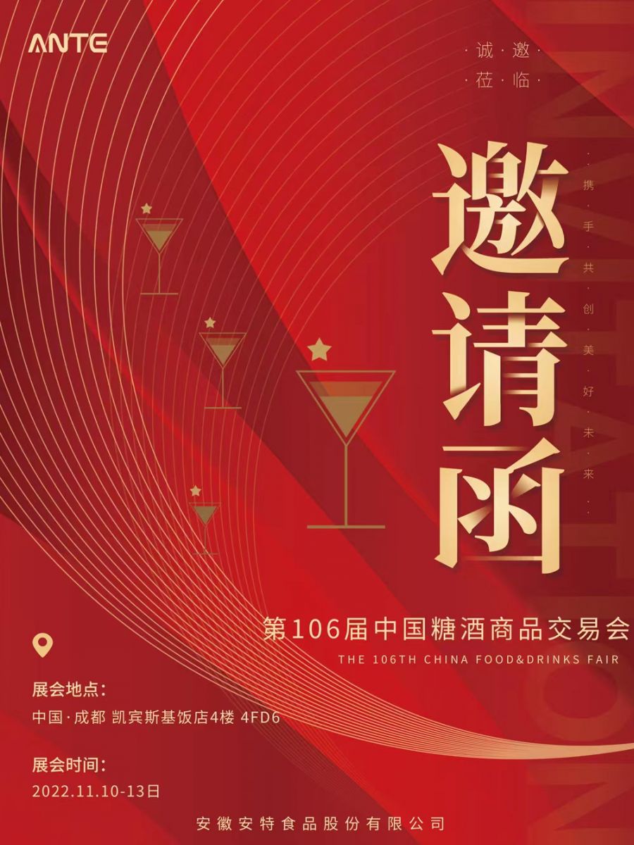 2022年11月10日-13日,第106屆全國糖酒會在成都開幕,安特攜眾多產(chǎn)品精彩亮相本次大會。我們誠邀您蒞臨安特展臺,共鑒美酒!